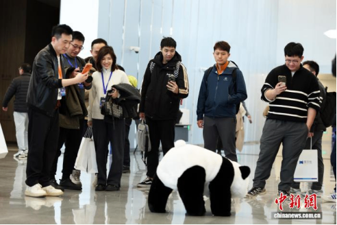 12月22日,中国首个开放式机器人租赁平台擎天租在上海发布。发布会场外,一款熊猫外观的机器人受到“围观”。